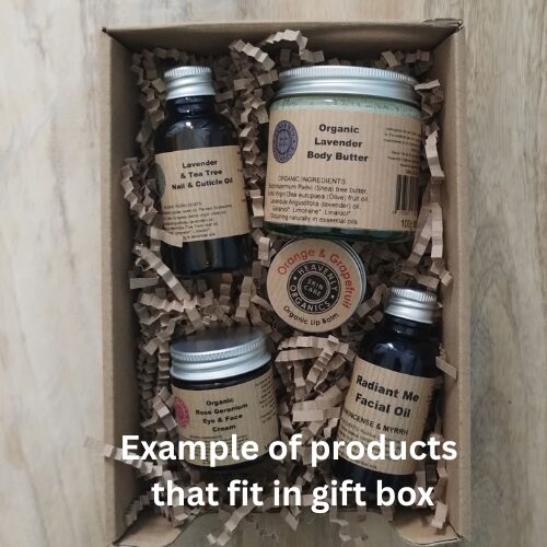 This gift box will fit most products in them. You could even fill out the box with 6 products such as from our range of hand & body creams, body & baby butters, facial scrubs & masks.