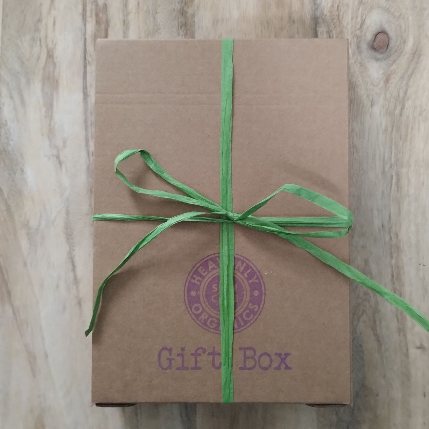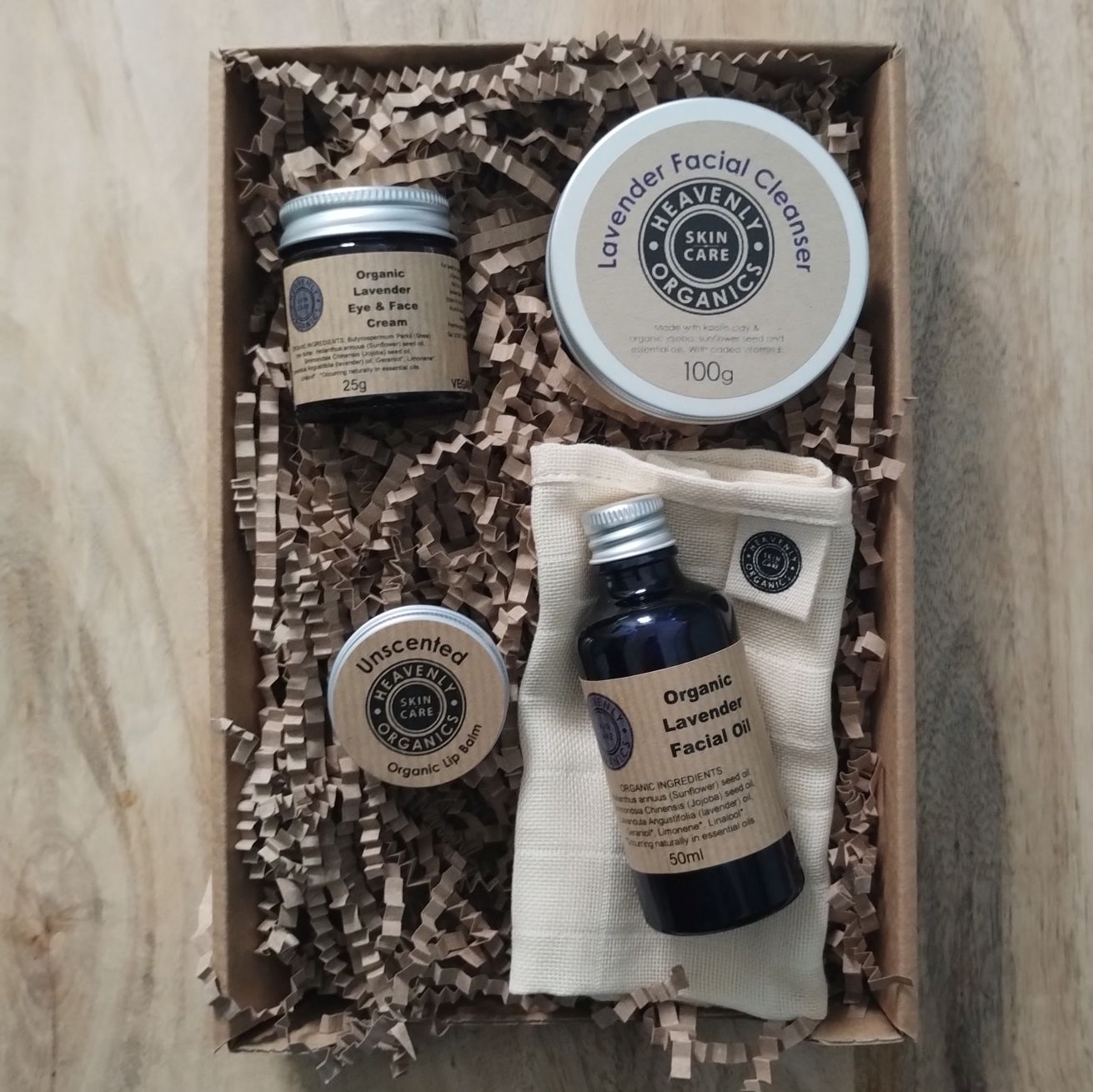 This lavender gift box contains: Lavender Facial Cleanser, Eye & Face Cream, Facial Oil, Unscented Lip Balm & an organic muslin cloth. The wood wool we use is chemical free and compostable.