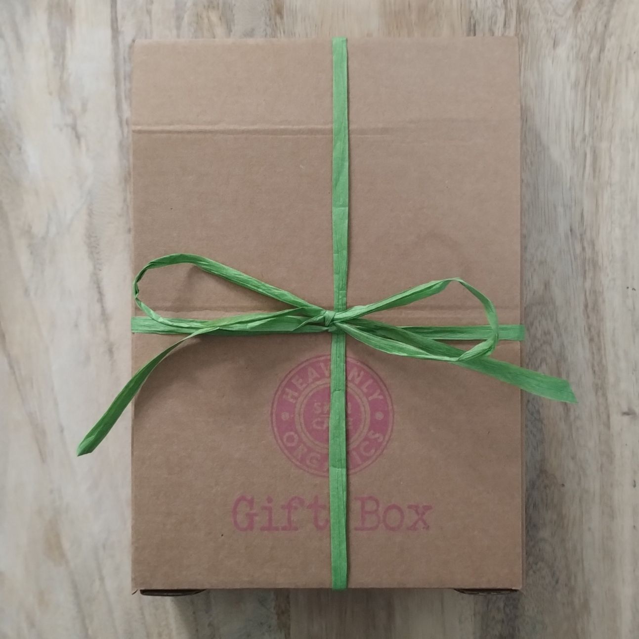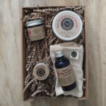 This gift box contains: Rose Geranium: Eye & Face Cream, cleanser , Facial Oil, Unscented Lip Balm , & an organic muslin cloth . The packing is made from recycled paper and is entirely compostable.